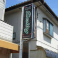 木枠にて看板枠を制作し、白ベニア貼り+印刷シートを貼り込んだ吊り看板となります。